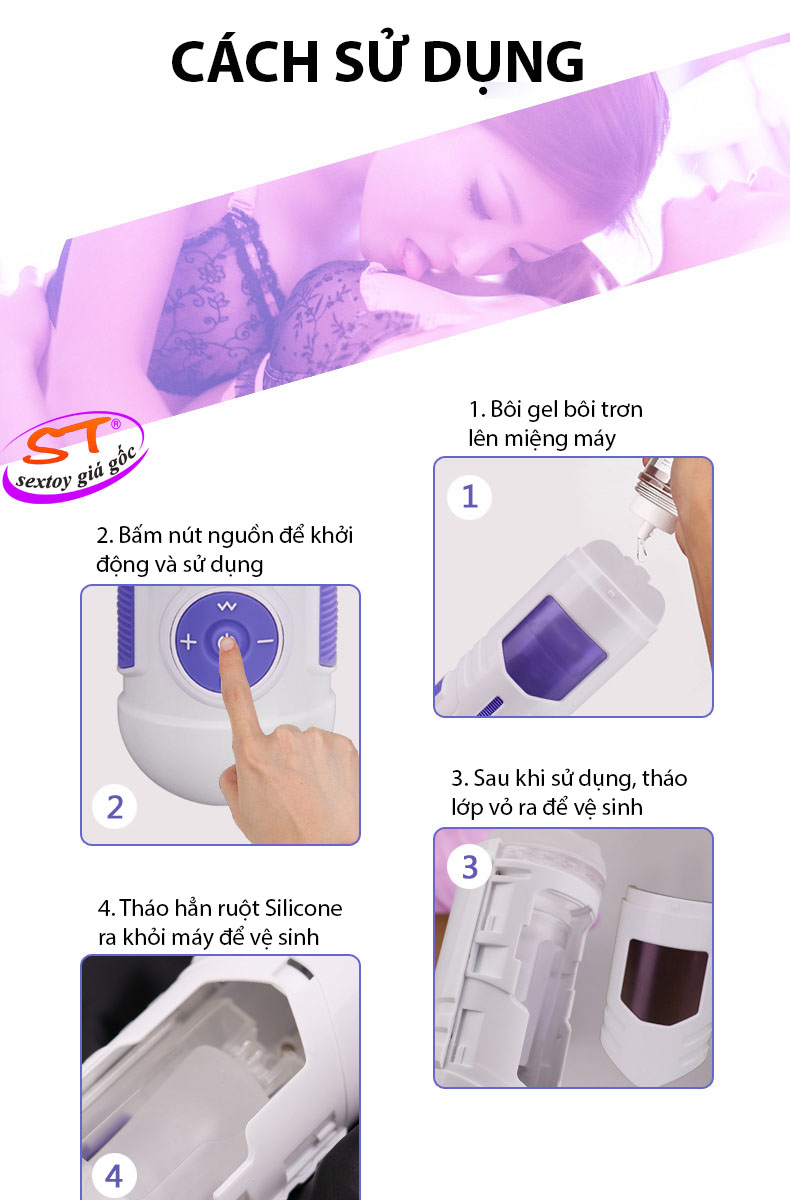 Gắn sản phẩm lên bề mặt phẳng mình thích, khởi động nguồn, điều chỉnh rung, thụt và đưa dương vật vào trong, sử dụng theo ý thích