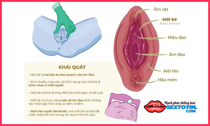 Môi bé (Labia minora/small lips) là hai lớp da nằm ngay bên trong môi lớn, bao quanh lỗ mở cửa âm đạo. Da môi bé rất mỏng và rất dễ bị kích ứng. Chiều dài của môi bé là từ 4 – 5 cm, rộng khoảng 0,5 – 1 cm.