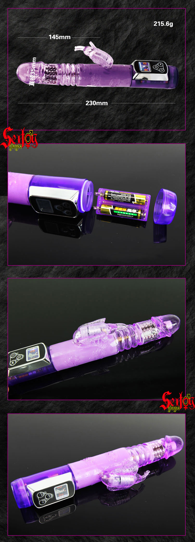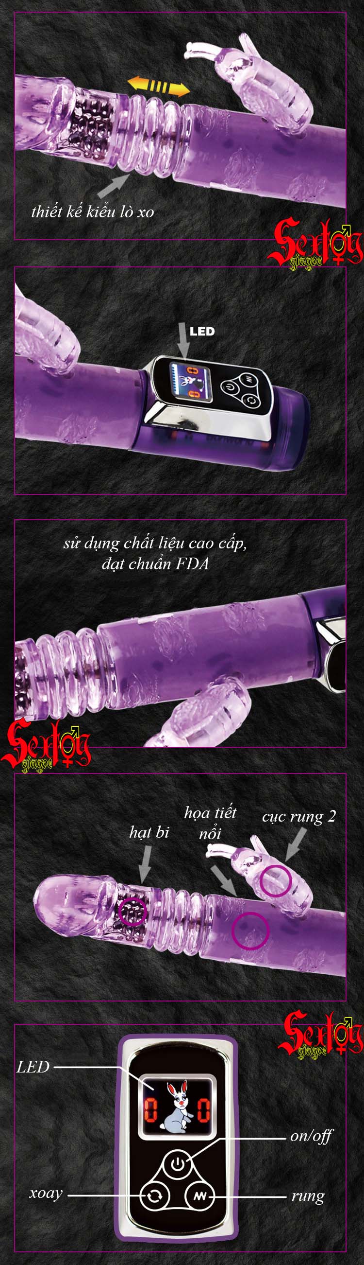 Chức năng: thụt/thò lên/xuống, 5 tần số rung, 5 tần số xoay, có thể xoay 360º.
