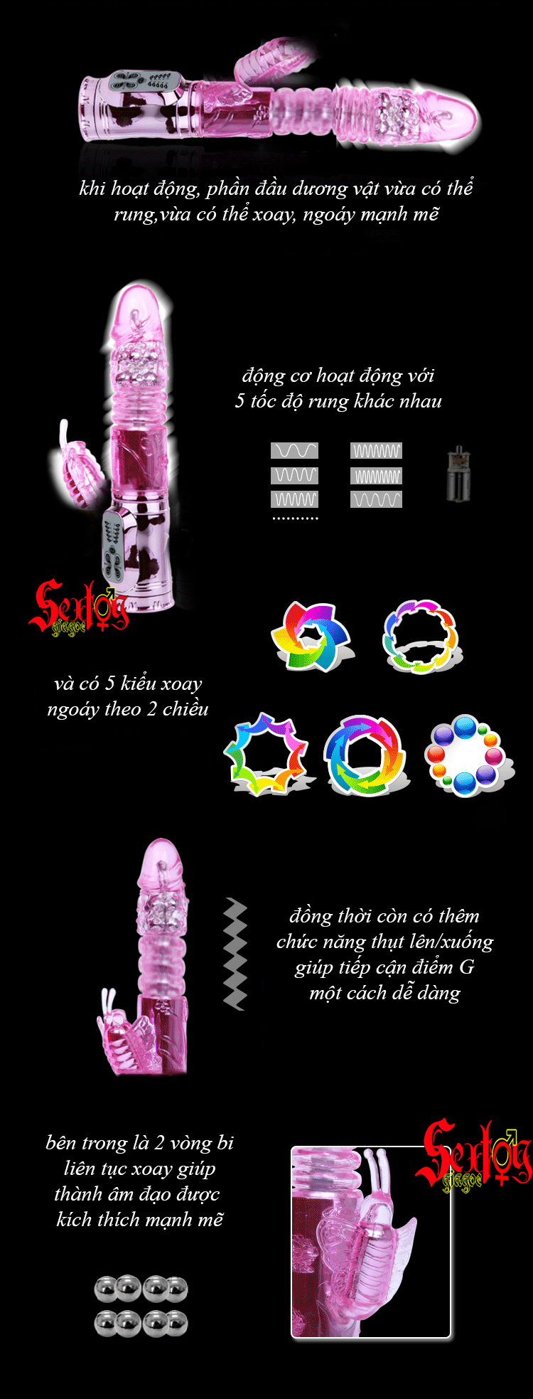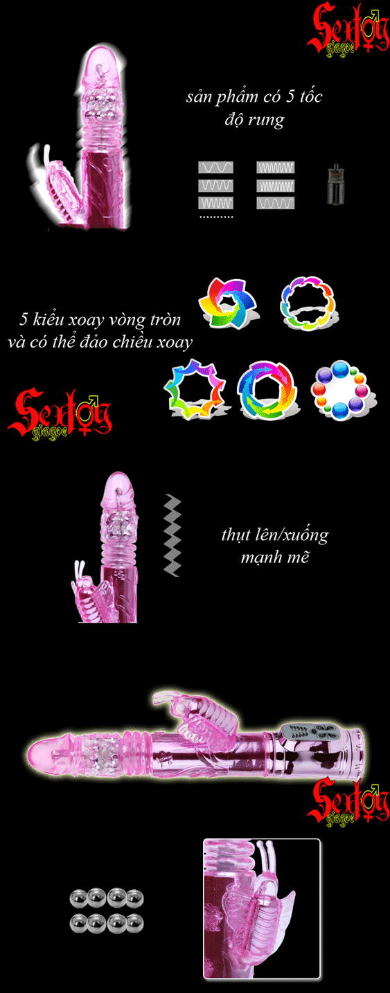 Nếu súng ống của chàng chỉ có thể kéo ra/đút vào thì anh chàng này lại vô cùng hoàn hảo khi vừa có thể rung mạnh mẽ, 2 vòng bi bên trong giúp xoay 360º theo 2 chiều lại vừa thụt thò lên/xuống 1 cách điệu nghệ giúp dễ dàng chạm đến điểm nhạy cảm nhất của nàng, lại thêm phần bìu của anh ta cũng rung lên bần bật, cho nàng sung sướng cả trong lẫn ngoài, ngây ngất, đê mê với vũ điệu hoang dã đầy mạnh mẽ, mãnh liệt của chàng ta.