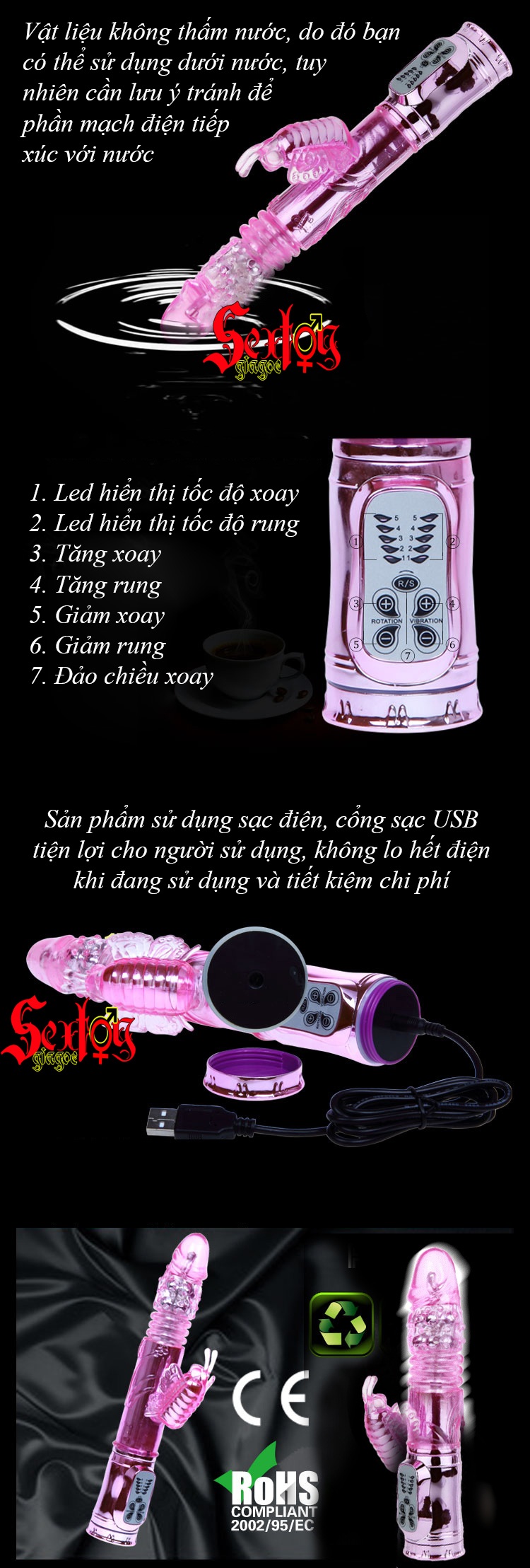 Chất liệu: nhựa ABS, TPE cao cấp, Silicone siêu mềm mại, đạt chuẩn RoHS, CE, tuyệt đối an toàn với người sử dụng.